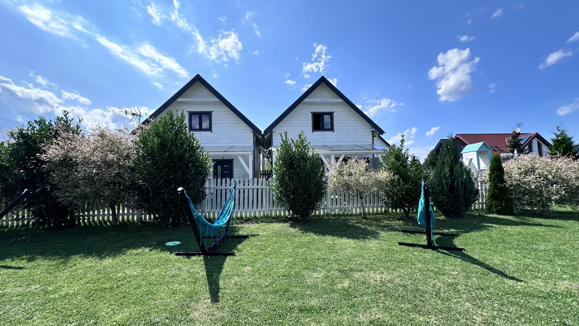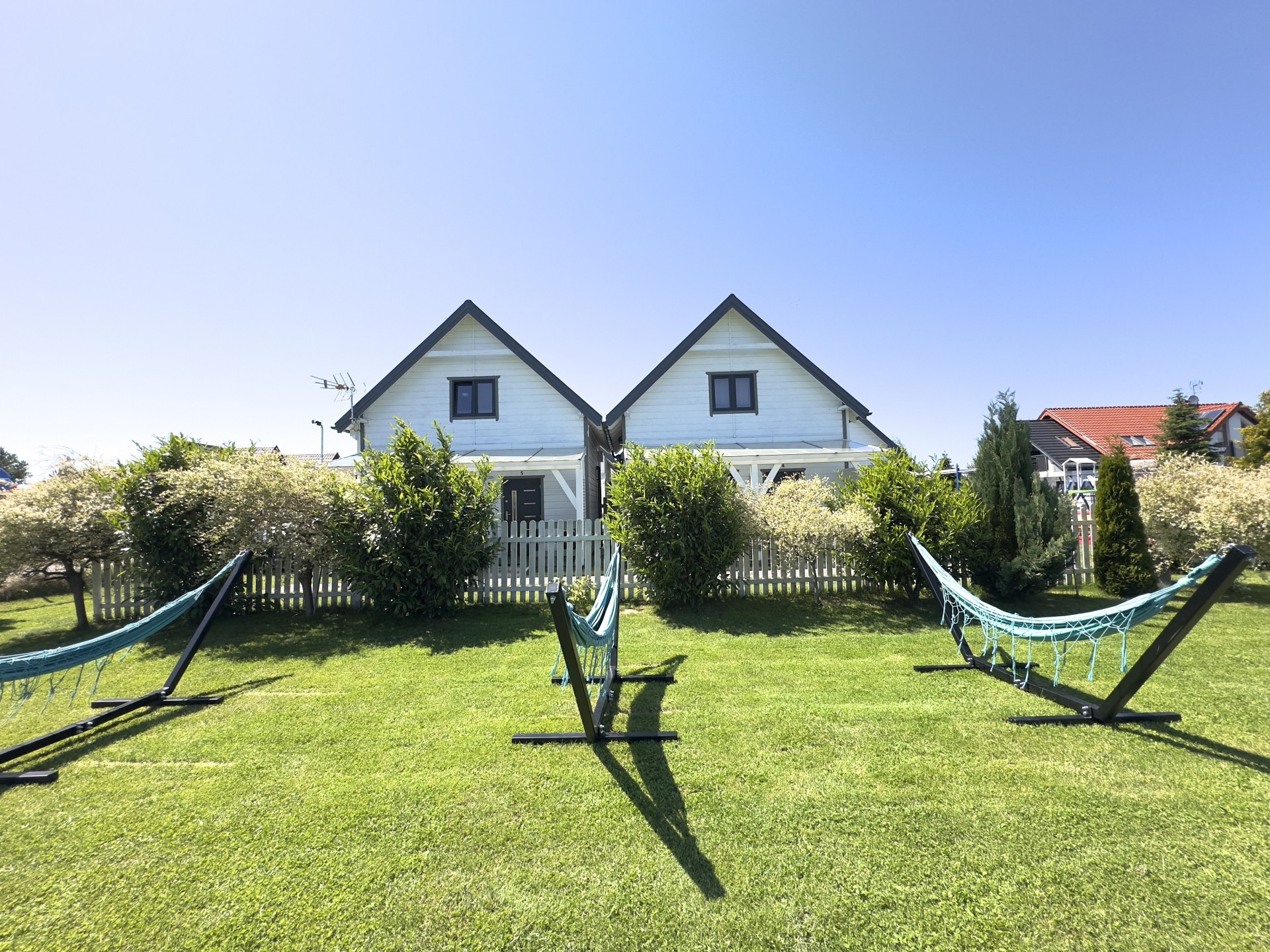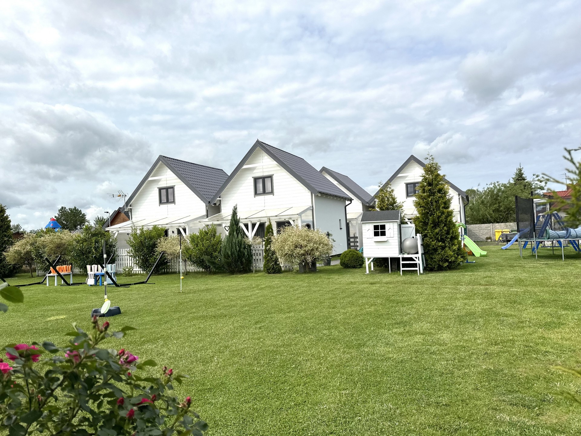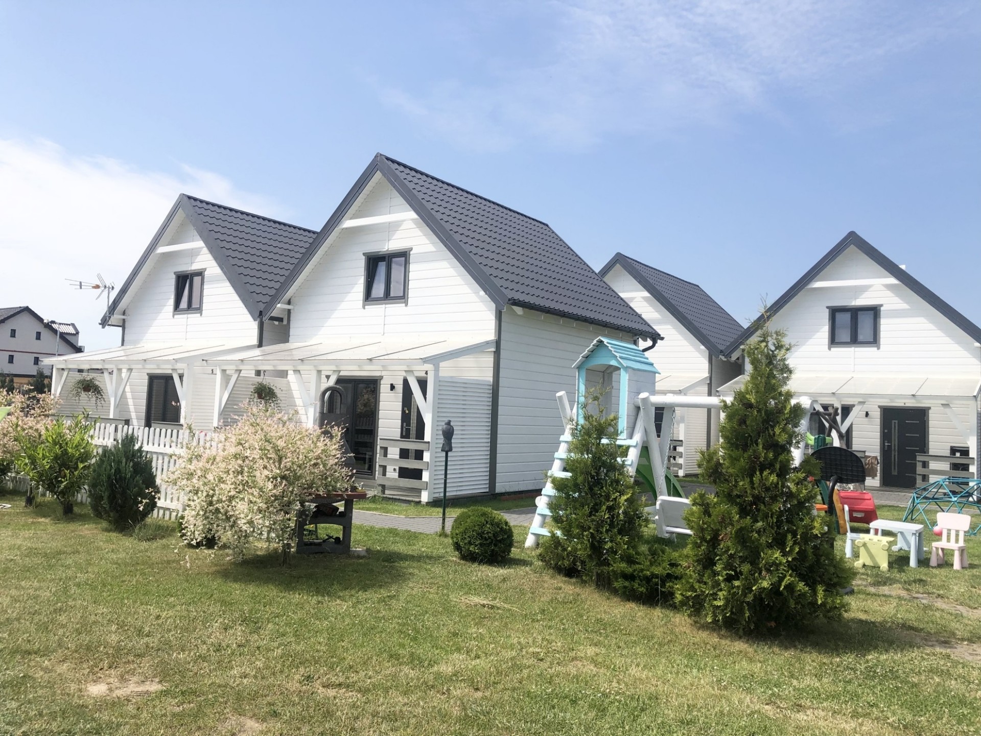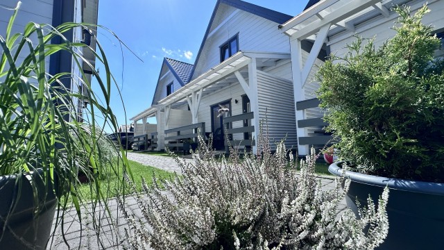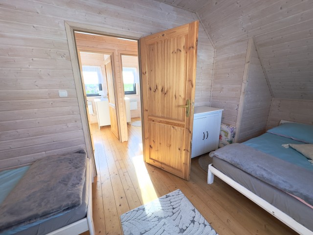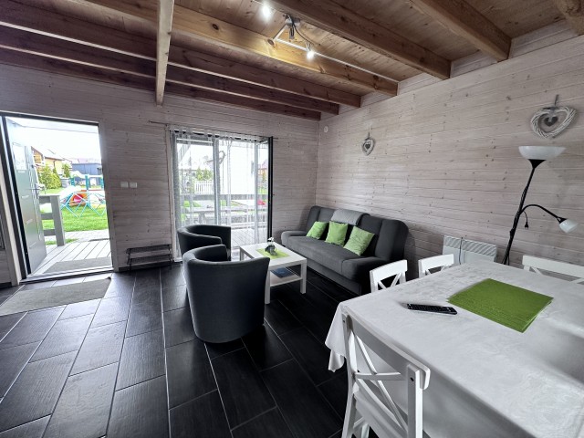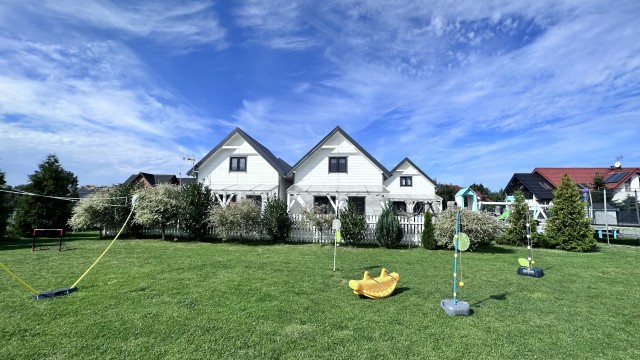Do Państwa dyspozycji przygotowaliśmy 5 drewnianych domków, oddalonych niecałe 400 m do plaży wygodnym, bezpiecznym chodnikiem, zejście na plażę promenadą. Domki są ocieplone, w pełni wyposażone z elektrycznym ogrzewaniem. Na piętrze przygotowaliśmy trzy sypialnie (dwie dwuosobowe z małżeńskimi łóżkami), jedna czteroosobowa (łóżko małżeńskie + dwa pojedyncze) i dodatkową toaletę z umywalką, dzięki niej nie trzeba w nocy schodzić na dół. W każdym domku dostępne udogodnienia dla dzieci: bramki zabezpieczające schody, krzesełka do karmienia, łóżeczka turystyczne, nakładki na toaletę. Plac zabaw jest ogrodzony, monitorowany. Na drugiej części ośrodka znajduje się mini boisko do gier: siatkówki, piłki nożnej, strefa z hamakami. Dostępne są duże, betonowe grille, a w domkach leżaki i parawany na plażę. Na zadaszonych tarasach przy każdej pogodzie można spędzać czas. Do każdego domku przygotowane dwa miejsca parkingowe w cenie pobytu, ogrodzone i monitorowane.