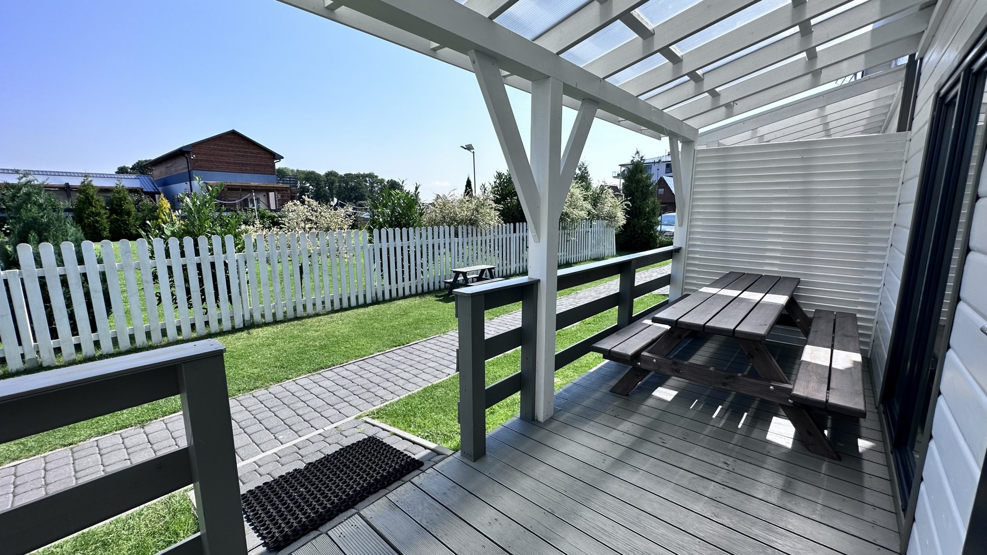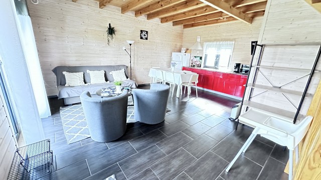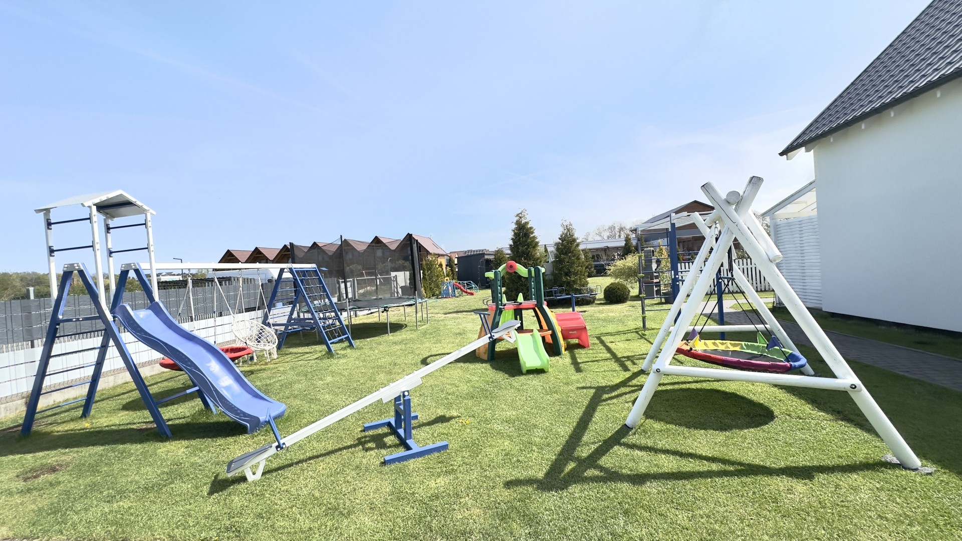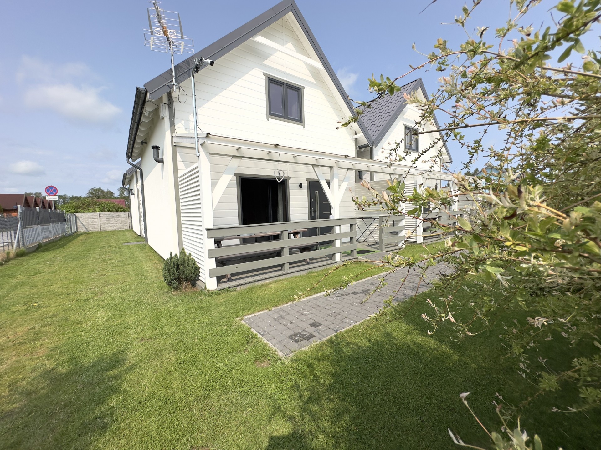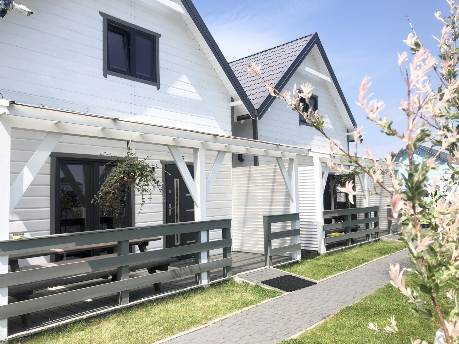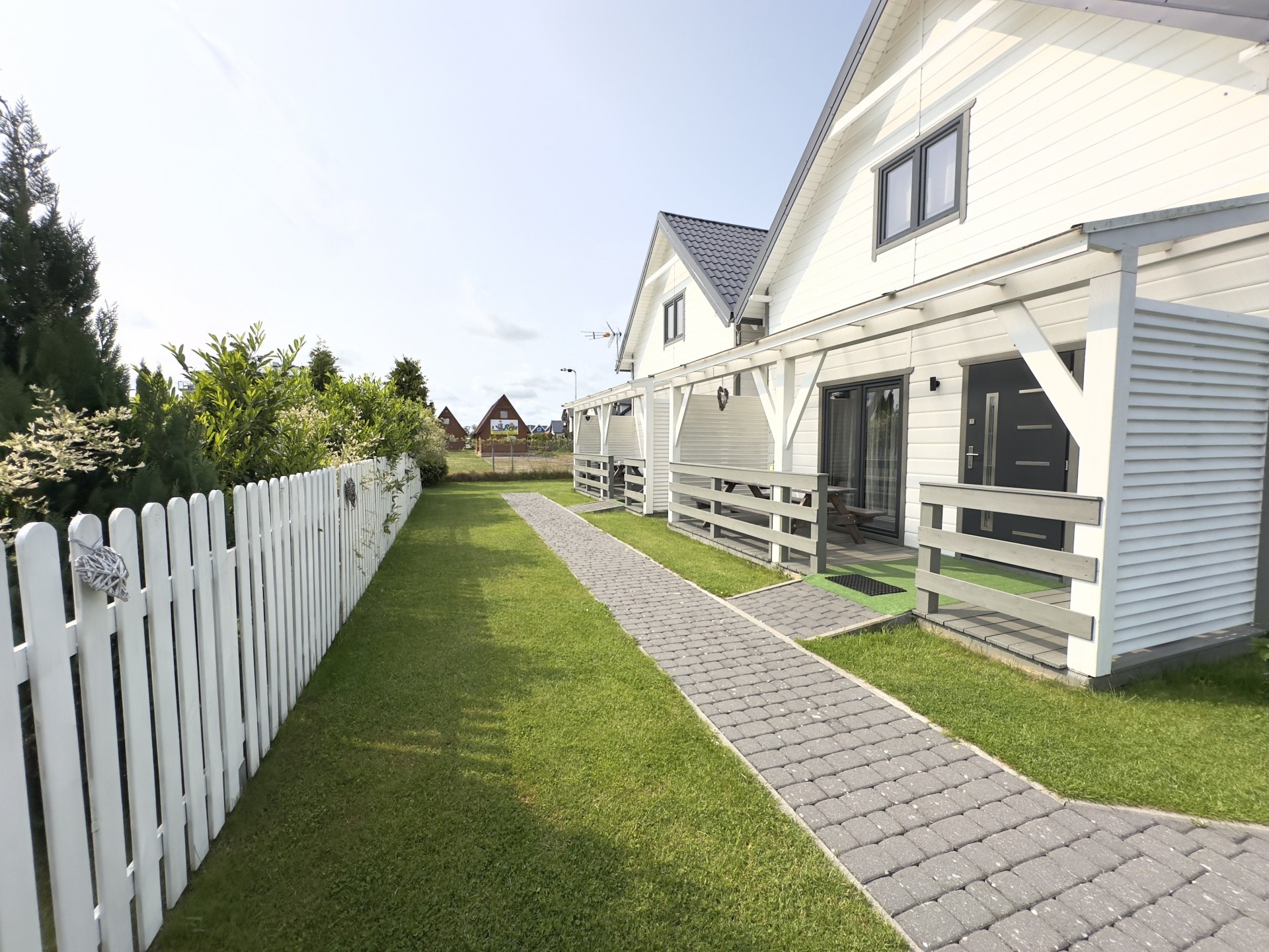 Do Państwa dyspozycji przygotowaliśmy 5 drewnianych domków, oddalonych niecałe 400 m do plaży wygodnym, bezpiecznym chodnikiem, zejście na plażę promenadą. Domki są ocieplone, w pełni wyposażone z elektrycznym ogrzewaniem. Na piętrze przygotowaliśmy trzy sypialnie (dwie dwuosobowe z małżeńskimi łóżkami), jedna czteroosobowa (łóżko małżeńskie + dwa pojedyncze) i dodatkową toaletę z umywalką, dzięki niej nie trzeba w nocy schodzić na dół. W każdym domku dostępne udogodnienia dla dzieci: bramki zabezpieczające schody, krzesełka do karmienia, łóżeczka turystyczne, nakładki na toaletę. Plac zabaw jest ogrodzony, monitorowany. Na drugiej części ośrodka znajduje się mini boisko do gier: siatkówki, piłki nożnej, strefa z hamakami. Dostępne są duże, betonowe grille, a w domkach leżaki i parawany na plażę. Na zadaszonych tarasach przy każdej pogodzie można spędzać czas. Do każdego domku przygotowane dwa miejsca parkingowe w cenie pobytu, ogrodzone i monitorowane.