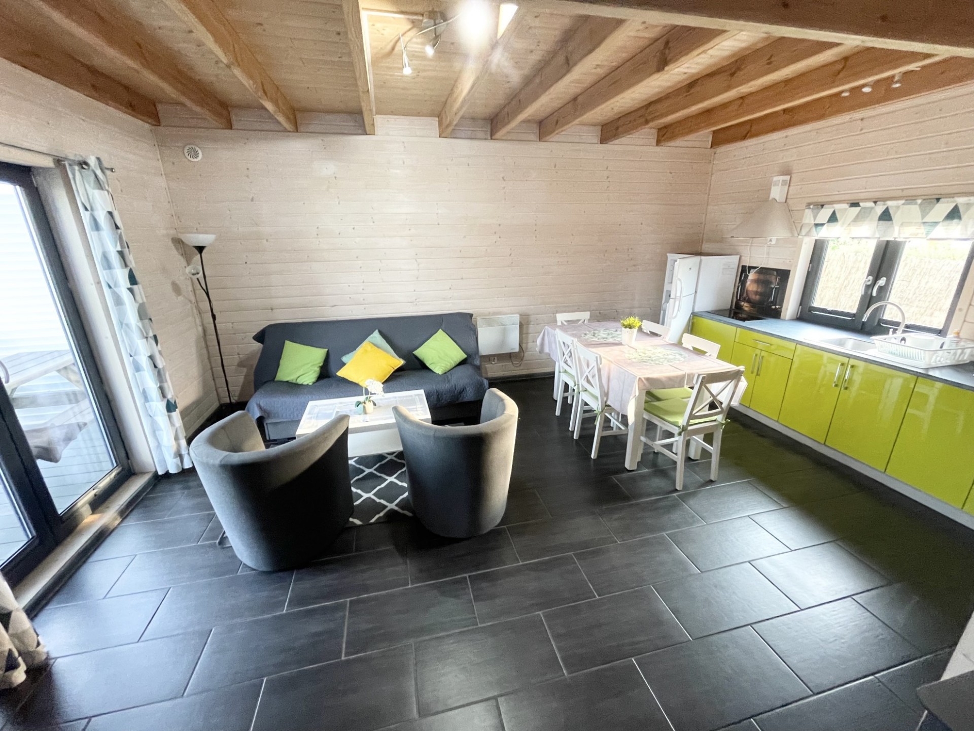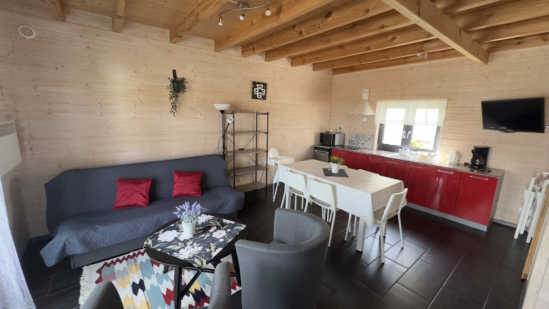 W domku mogą wypoczywać od 4 do 8 osób a wykorzystując kanapę na dole nawet 10 osób ( za dodatkową opłatą). Powierzchnia całkowita domku to 70 m2. , plus zadaszone duże tarasy wyposażone w ławy biesiadne.