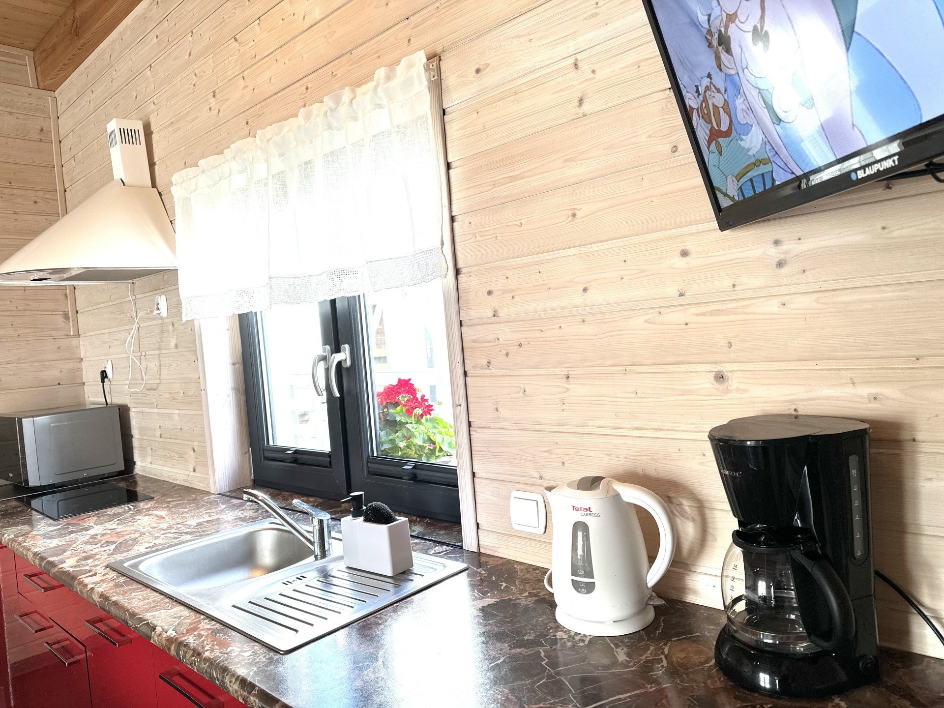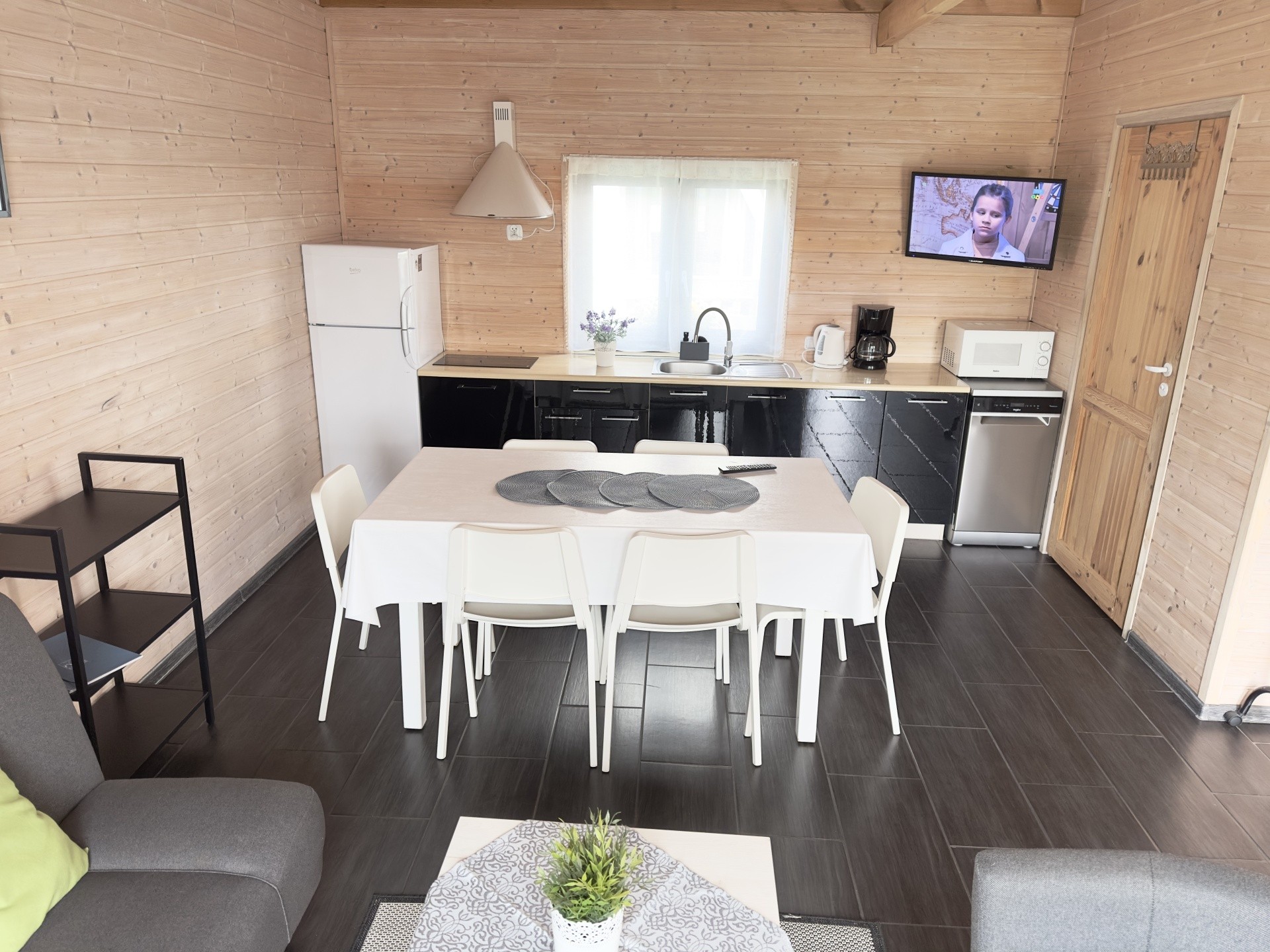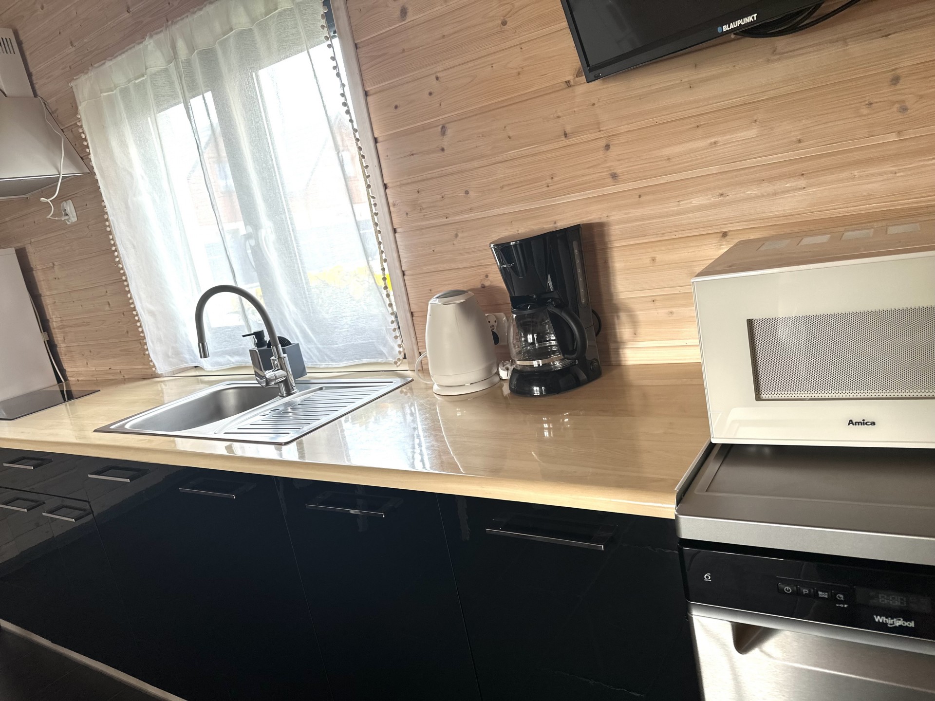 kuchnia w pełni wyposażona: dwupalnikowa płyta elektryczna, duża lodówka, czajnik, mikrofalówka, naczynia, garnki, zaparzacz do kawy.