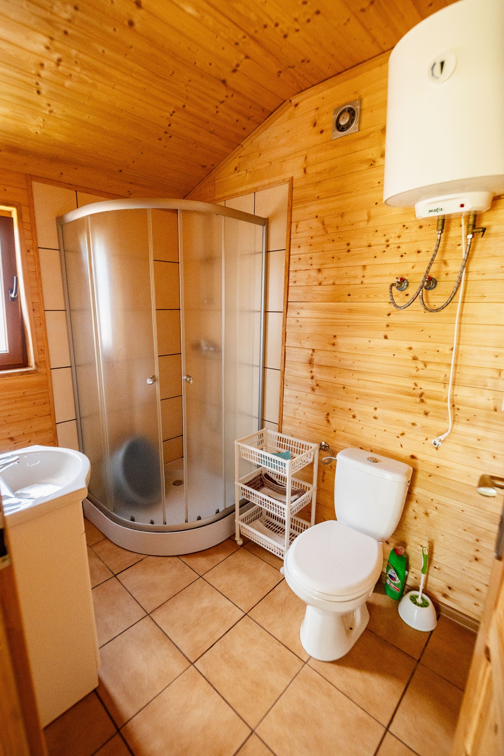 - Łazienka - kabina prysznicowa, toaleta, szafka z umywalką, lustro