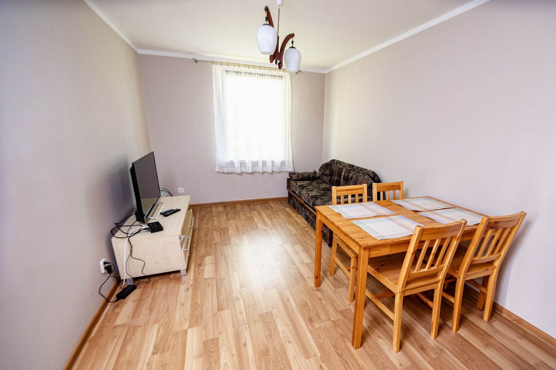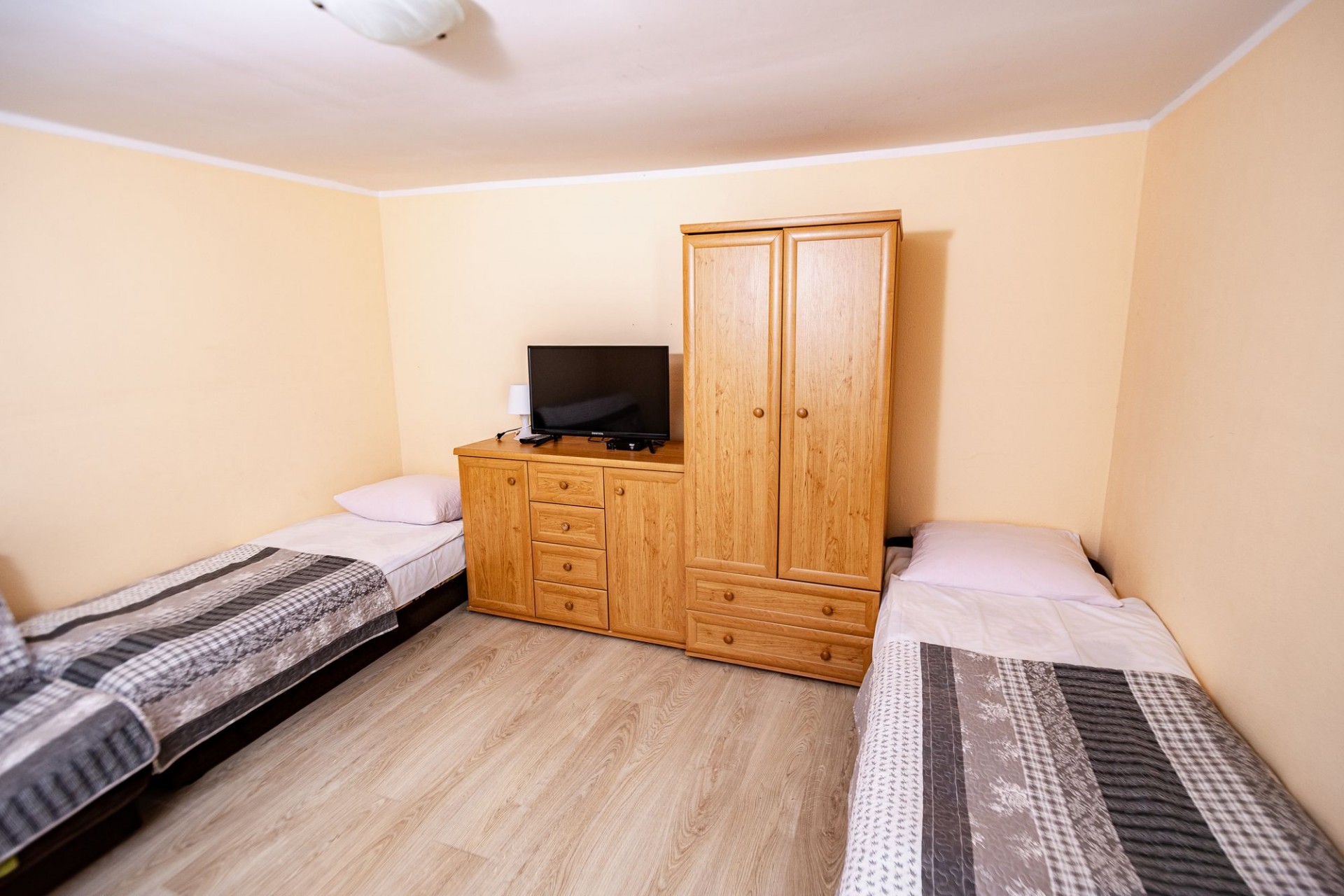 - Pokój duży - szafa na ubrania, łóżka, stół z krzesłami, komoda, tv