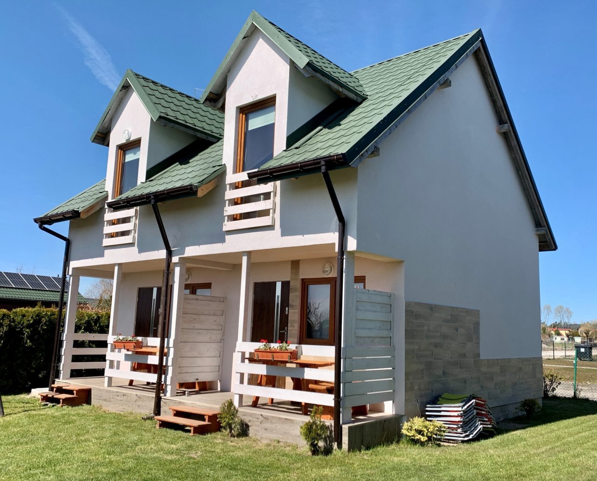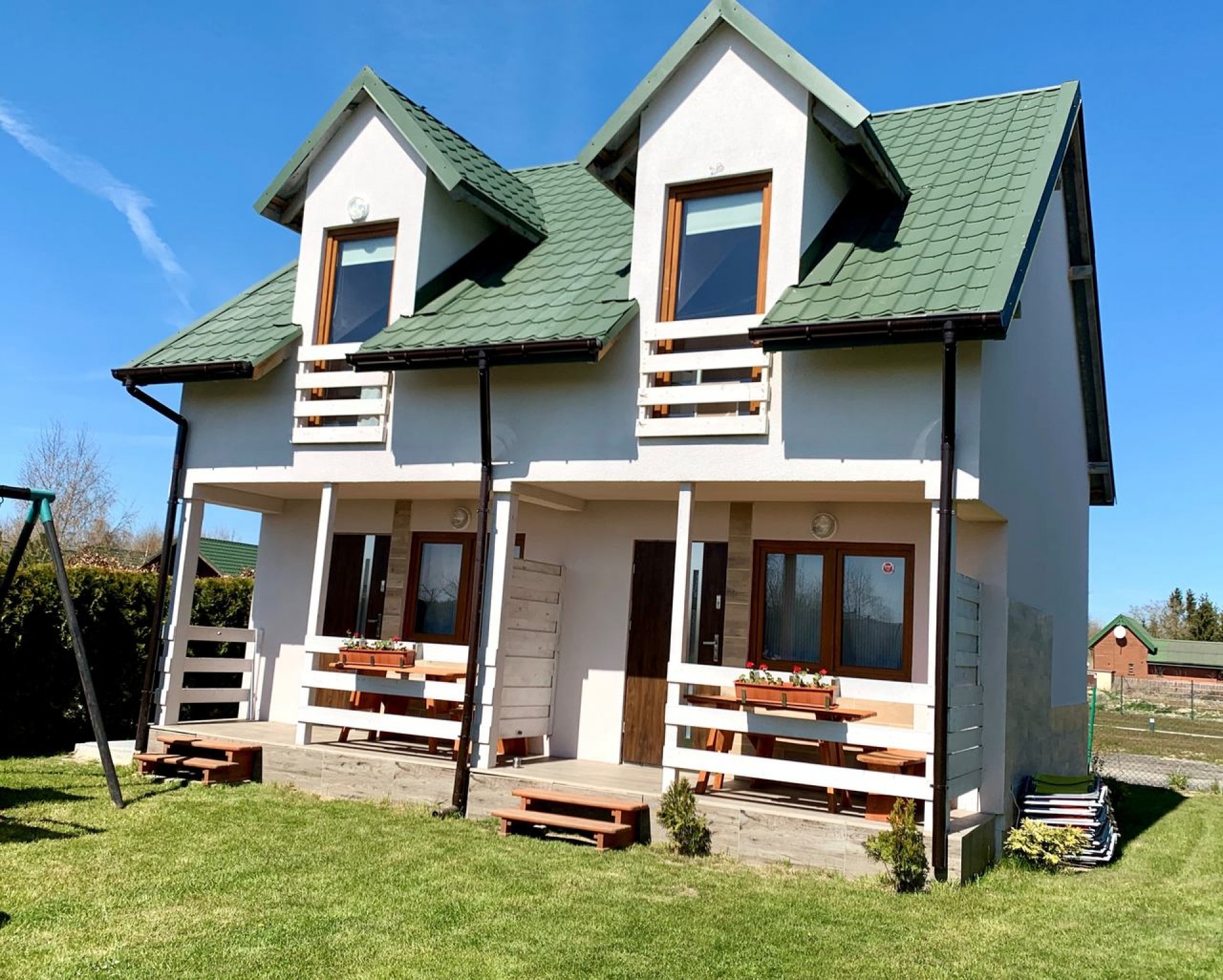 Domki blisko plaży z dwiema osobami sypialniami, salonem, aneksem kuchennym, łazienką i słonecznym , zadaszonym tarasem. Kolorowy plac zabaw dla dzieci - widoczny z domków . Bezpłatny parking dla aut naszych Gości .