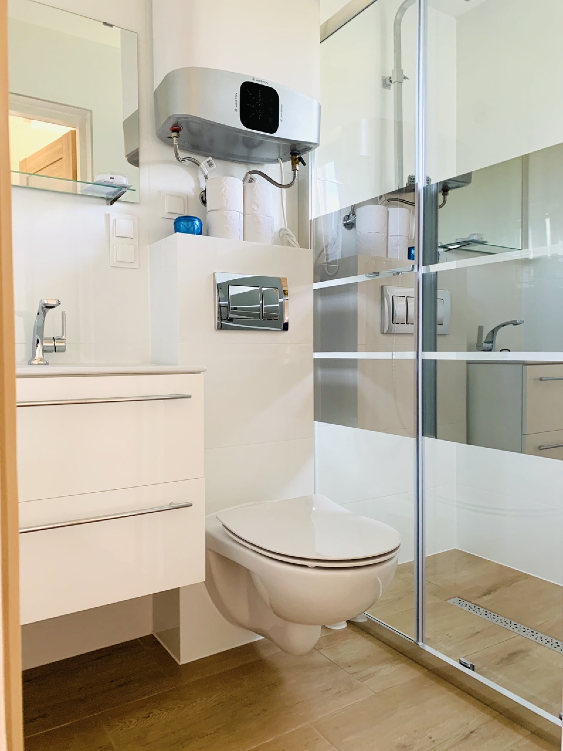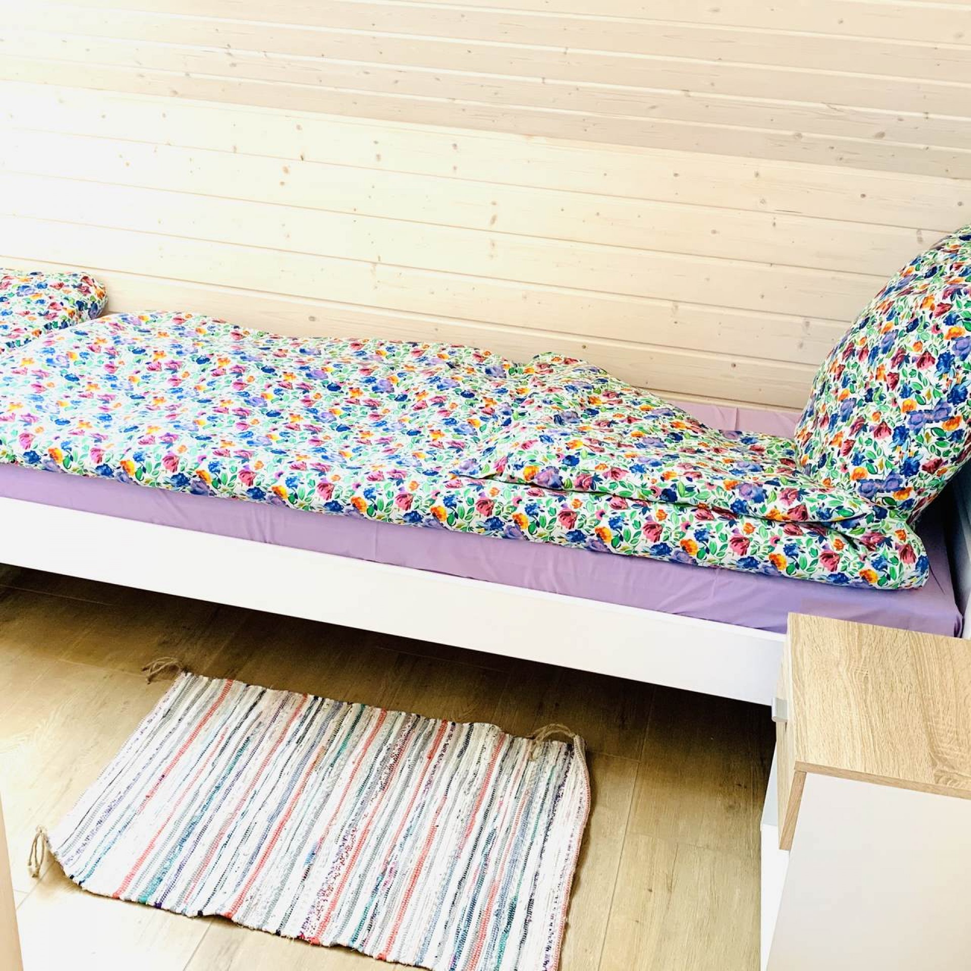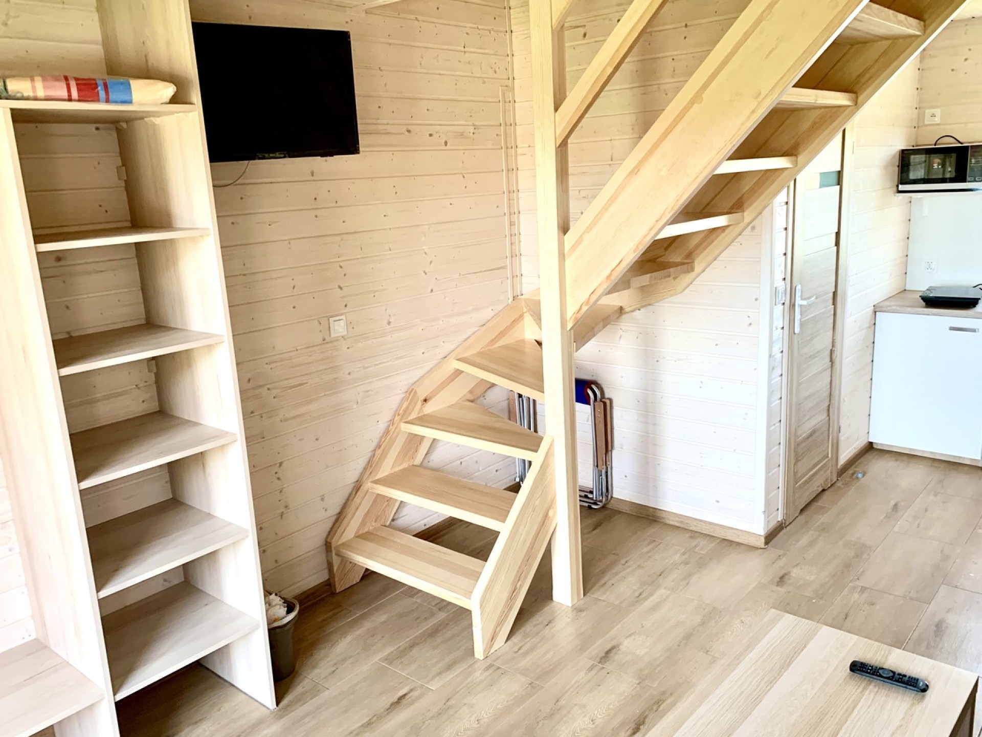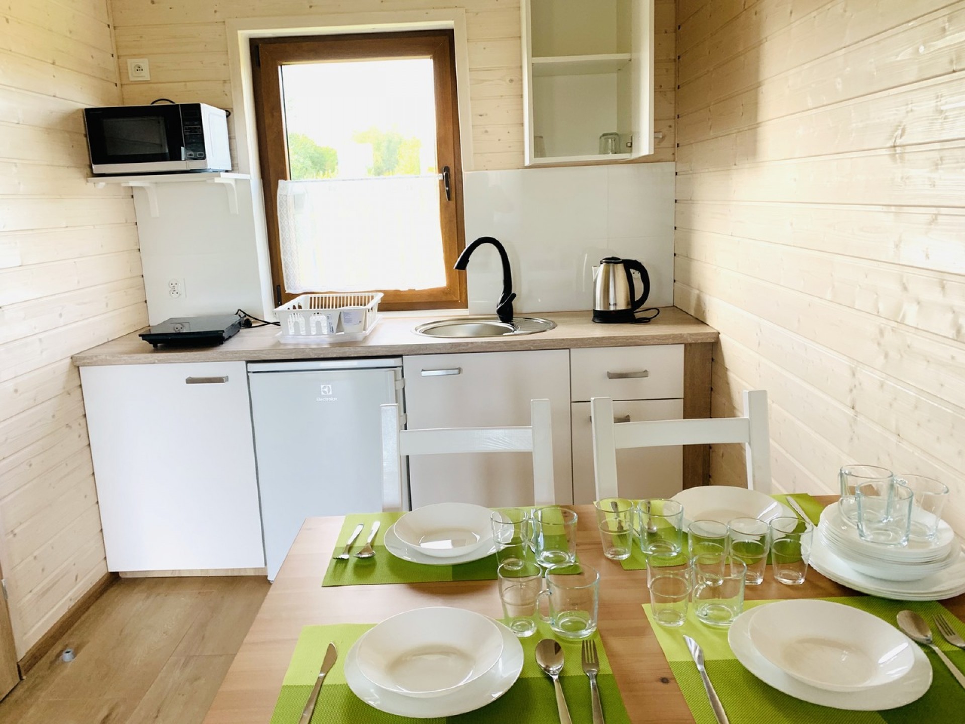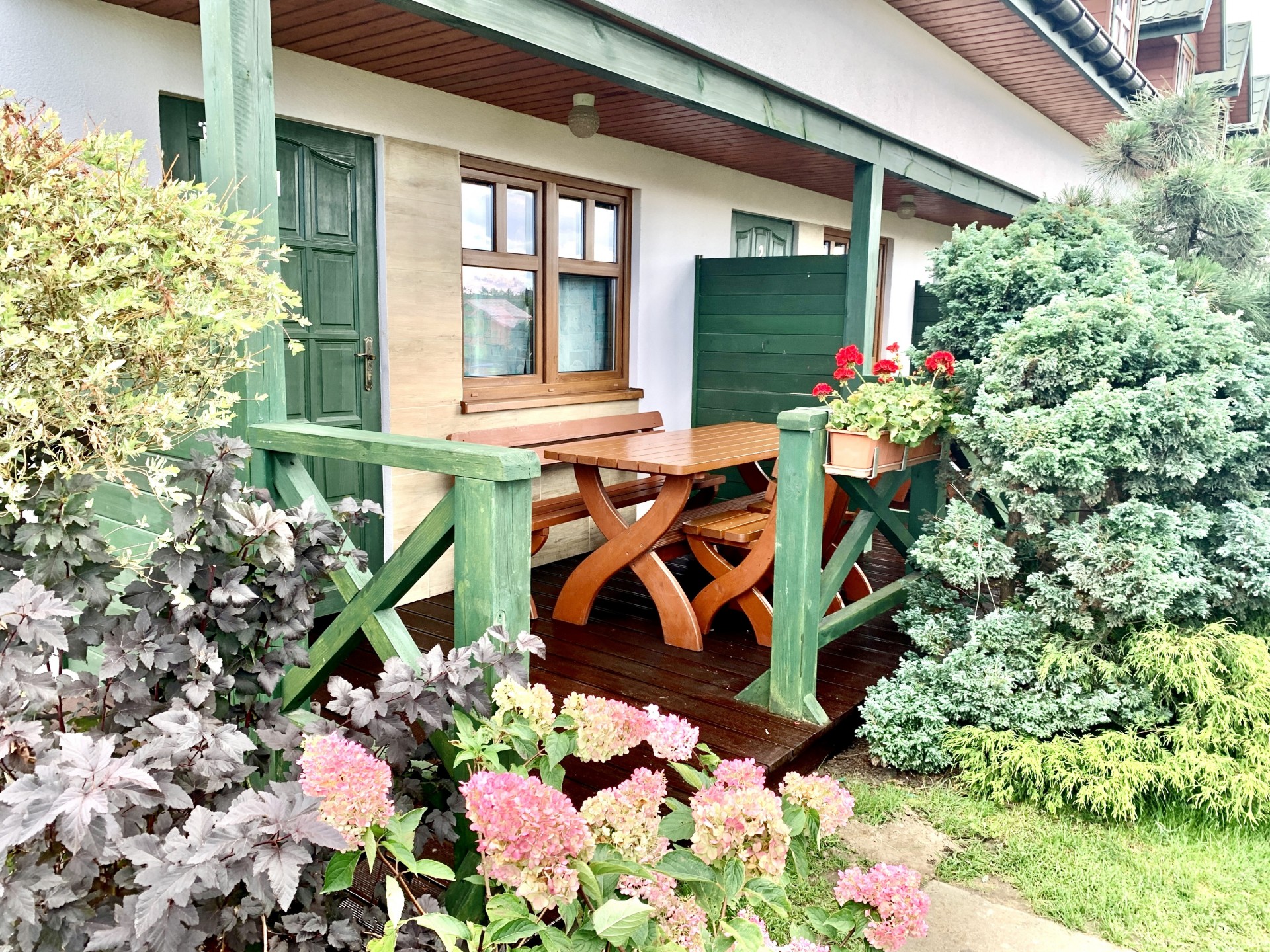 Każdy domek posiada dwie osobne sypialnie zamykane pełnymi drzwiami , salon połączony z aneksem kuchennym, łazienkę oraz słoneczny zadaszony taras.